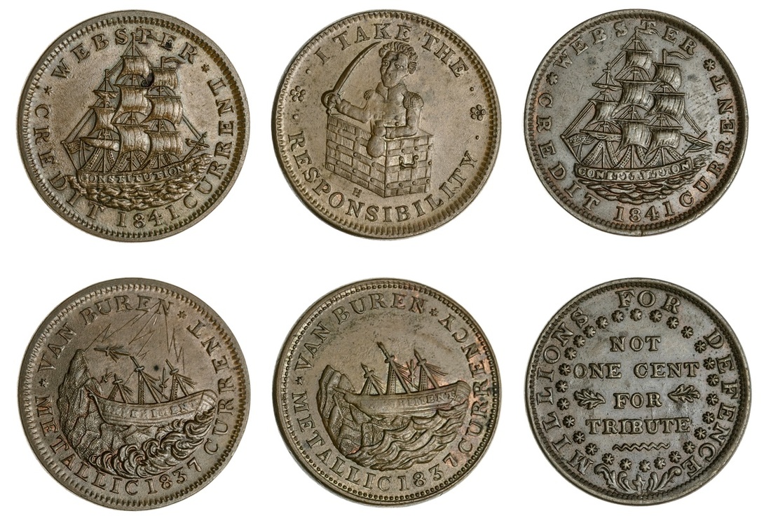 Trio of Hard Times Tokens. HT-16, Low 58 Webster, Not One Cent. Good EF; HT-20, Low 62 Webster, Current. Choice AU; and HT-69, Low 44 I Take the Responsibility-Van Buren "Metallic". AU. All Ex Allan Lee Scott Sale, NASCA, April 28-30, 1980. (3)