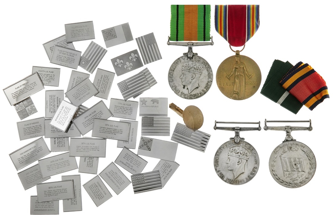 Grouping of small Sterling Silver Bars. History of the U.S. flag. Colonial period flags, U.S. flags various stages, etc on one side, information the other. Total weight: 7.49 Oz. Uncirculated; also ribboned medals (4) - U.S. WWII service, Pakistan independence, India 1945, British 1939-1945.