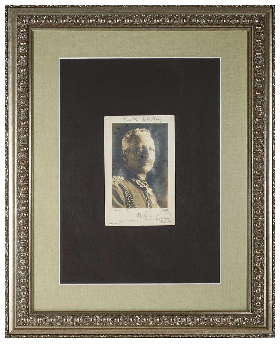 Kaiser Wilhelm II. The last German emperor; in the wake of uprisings in Berlin, the mutiny of his beloved Imperial Navy, and revolutionary unrest, Wilhelm abdicated both his imperial and the Prussian titles November 9, 1918, going into exile in the neutral Netherlands the next day. He first settled in Amerongen, then purchased a country house in Doorn which he moved into May 15, 1920. He died there the 4th of June 1941. Autographed Photo Postcard in exile. B&W postcard portrait of a uniformed Wilhelm II facing ¾ right, "Doorn 1-IV-1921". Notation above "Zinn 70". Wilhelm signs below his image in pencil. Matted and in an ornate-bordered frame, 15 ¼ x 19 ¼". A Fine autograph.