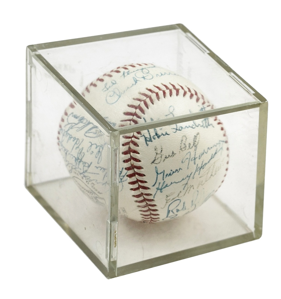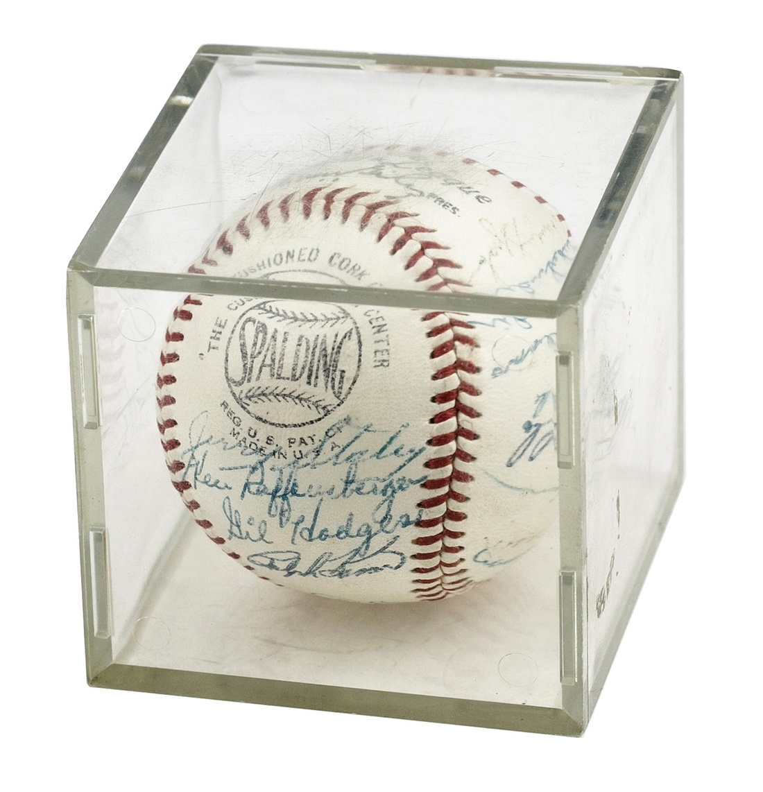 Late 1940s-1950s Baseball Stars Autograph-signed Ball. 25 signatures, including Gil Hodges, Enos Slaughter, Pee Wee Reese, Roy Campanella, Jackie Robinson (ink weakened, but legible), Duke Snider, Warren Spahn, Ted Kluszewski, Carl Furillo, Ken Raffensberger, Jerry Staley, Hobie Landrith, Gus Bell, Dave Williams, Ed Mathews, Harvey Haddix, Curt Simmons, Cookie Lavagetto, Joe Black and Chuck Dressen. Signatures mostly sharp and bright, the ball clean and well-preserved. Ex Leland's Scrapbook Auction, Dec. 12, 1992, lot 112.