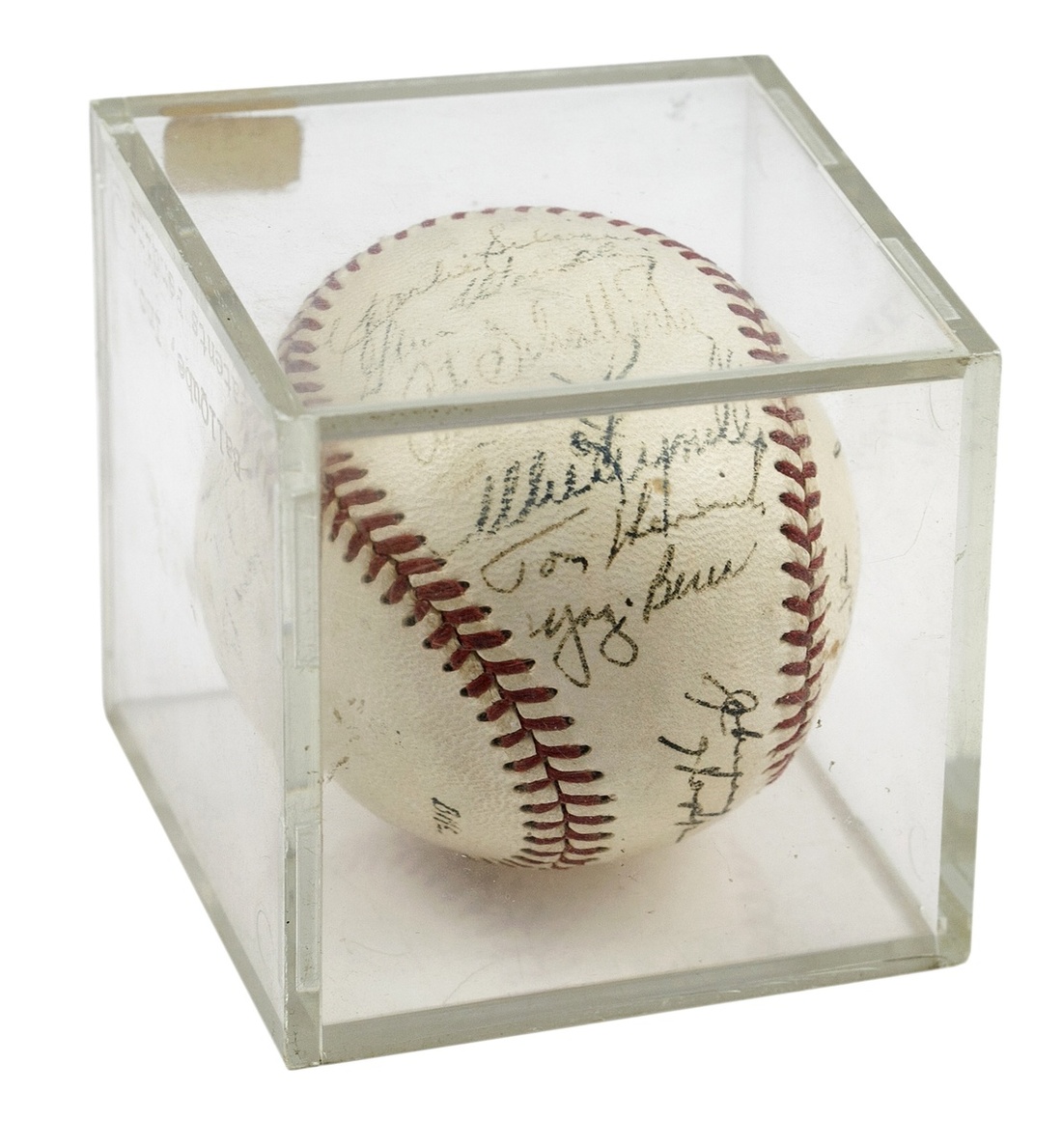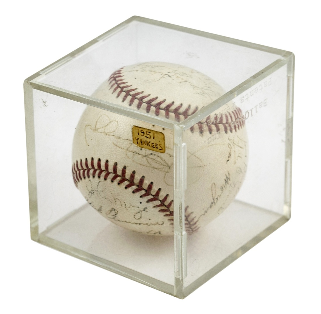 1951 New York Yankees Team-Signed Ball. Mickey Mantle's rookie year. 22 signatures including Mantle's. Ink weakening on some signatures, but all clear and legible. Overall well-preserved, the ball seam sharp and intact. A rare and very displayable ball. Ex Leland's Scrapbook Auction, Dec. 12, 1992, lot 48.