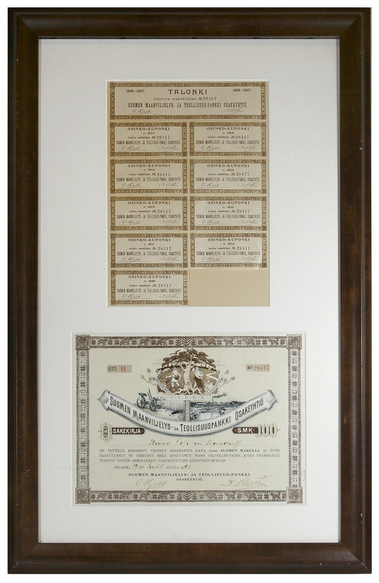 Finland. Suomen Maanviljelys ja Teollisuuspannki Osakeyhtiö - Finnish Bank of Agriculture and Industry. Certificate for 100 Shares, Helsinki 1898. Brown borders, blue title, vignette of an old sower and blacksmith between swastika-adorned tree above. Extremely Fine. Framed with nine coupons.