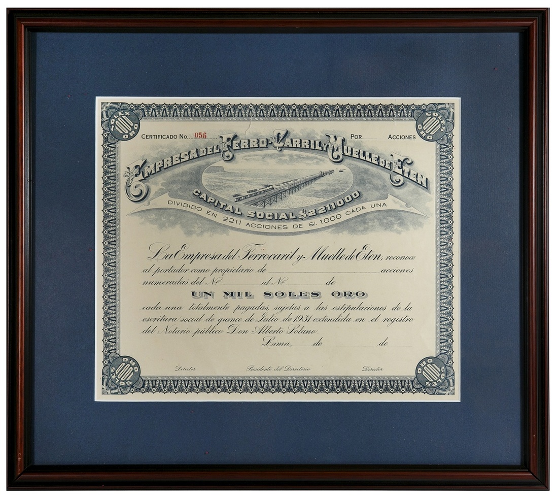 Peru. Empresa del Ferro-Carril y Muelle de Eten. Certificate for 1000 Soles. Unissued. Steam train travelling over raised water port bridge. Uncirculated. Framed.