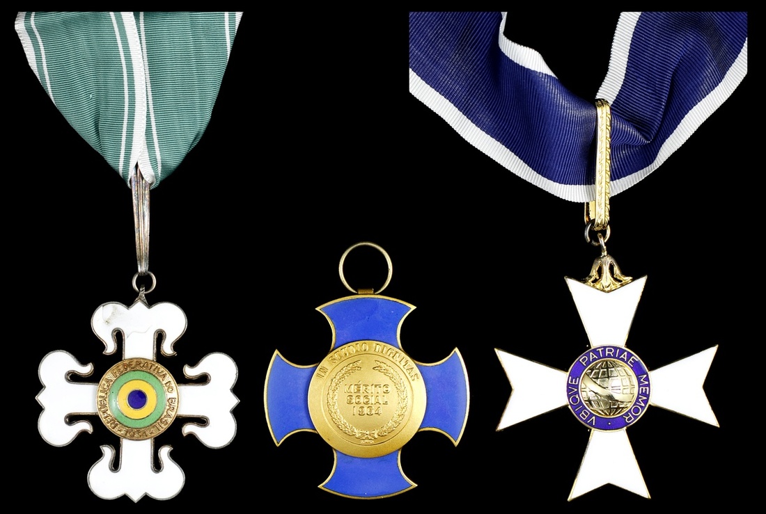 Brazil. Trio of modern Orders: Order of Military Merit. Neck Badge. Gilt and white enamel. Scuffs to three of the cross arms; Order of Rio Branco. Commander's Neck Badge. Gilt and white and blue enamels. Order of Social Merit. Badge. Gilt and blue enamel. No ribbon. Extremely Fine. (3)