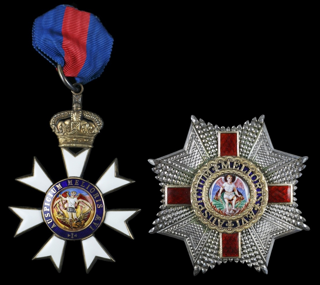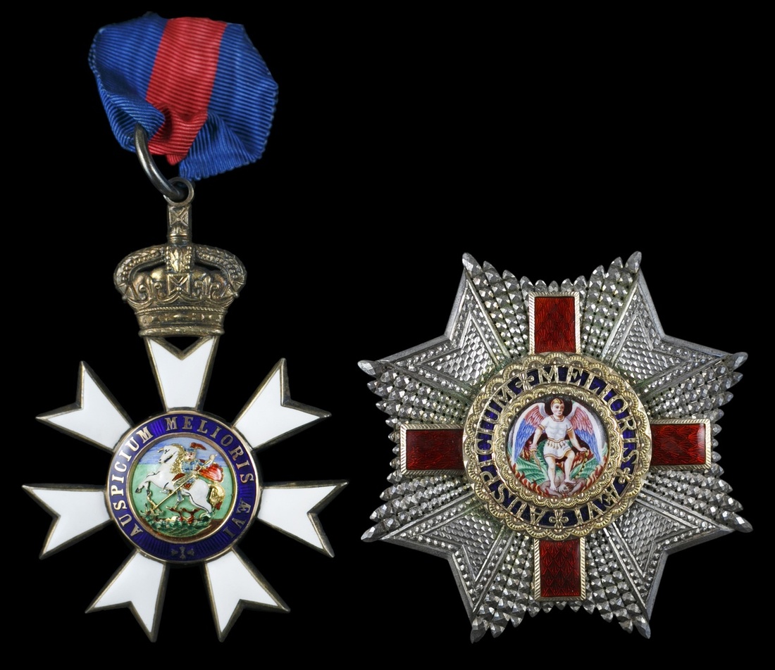Great Britain. The Most Distinguished Order of St. Michael and St. George. K.C.M.G. Knight Commander's Set of Insignia. Breast Badge. 62 x 86mm (including crown suspension). Silver gilt and enamels; Star. 81mm. Silver, silver gilt and enamels, with gold retaining pin. In Garrard & Co, London case of issue. Choice Extremely Fine.