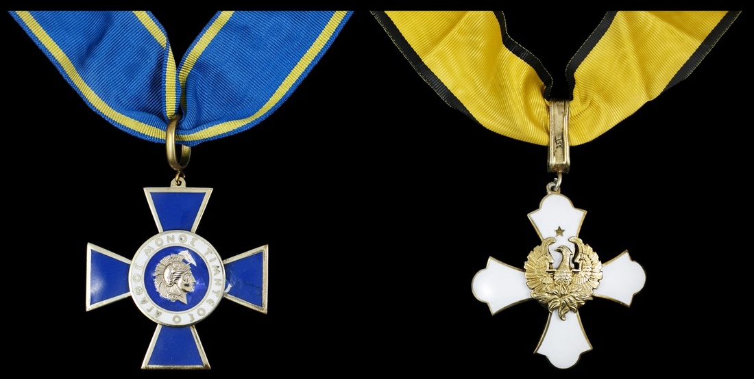 Greece. Pair of Orders: Order of the Phoenix. Neck Badge. Silver gilt and white enamel; and Order of Honor. Commander's Neck Badge. Gilt, white and blue enamels. Blue enamel chipped at one cross tip. In Dimiorgies case of issue' also Grand Cross sash for Order of Phoenix. VF-EF.