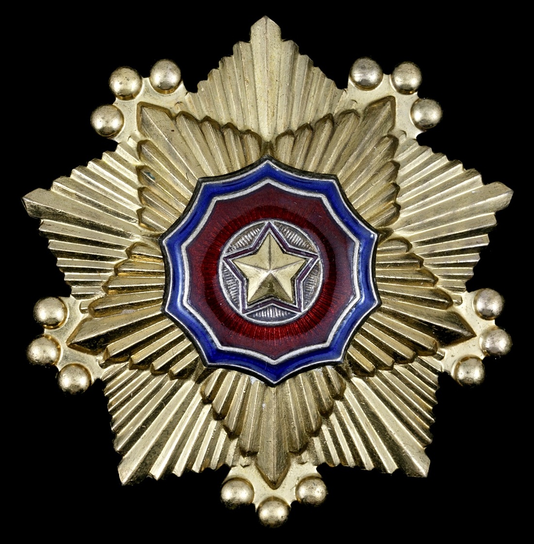 North Korea. Order of the National Flag. 1st Class. Type 4, vertical pinback. Gilt, silver, enamels. #15287. In original case. Extremely Fine.