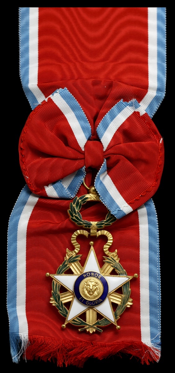 Paraguay. Order of Merit. Commander's Badge. 60mm. Gilt and enamels. Facing gilt lion head on central medallion; "1865" at center of back. On Grand Cross sash (incorrect, but correct colors). Extremely Fine.