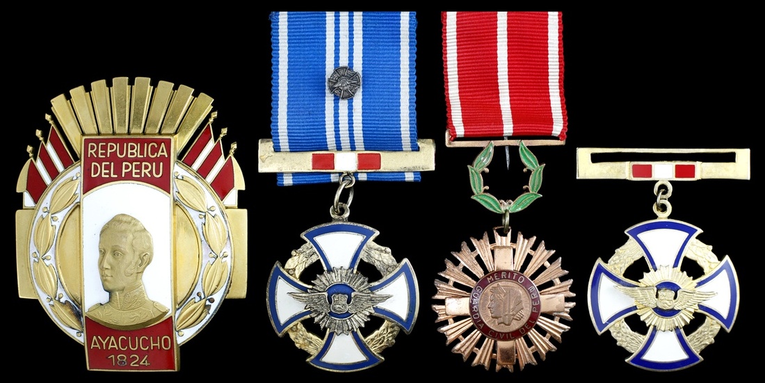 Peru. Lot of Orders and Decorations. Includes: Order of Ayacucho. Gand Cross Star. 65 x 82mm. Bronze gilt and enamels. Casa de Moneda, Lima; Order of Aeronautical Merit. Breast Badges. 43mm, 42.5mm. Silver gilt and enamels. One with bar and miniature pinback on ribbon, the other with bar, no ribbon; Guardia Civil Merit Medal. Gilt and enamels. Extremely Fine. (4)
