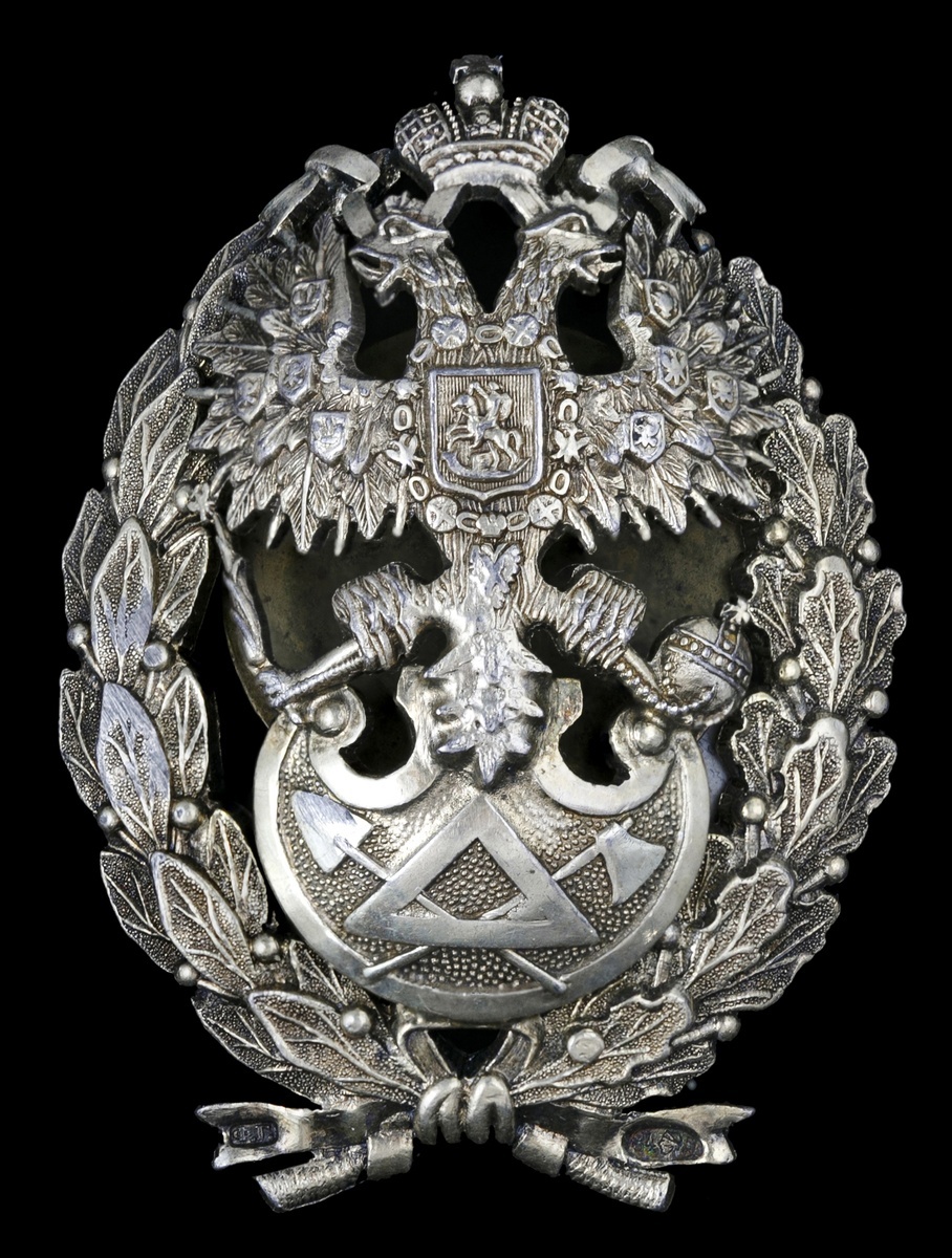 Russia. Imperial. Badge for Civilian Engineers who graduated from the Building School with the right to the rank of 10th Class. Silver, silver gilt. P/B 2.5. Some old test scratches on back. Extremely Fine.