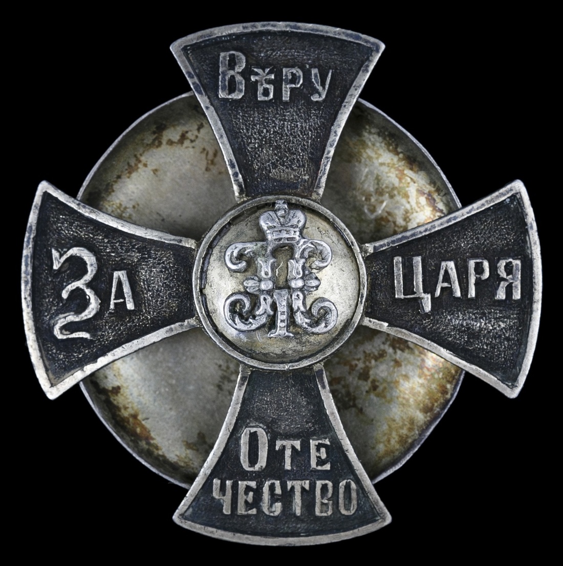 Russia. Imperial. Badge of the State Militia, Nicholas I. Silver. Screwback. Maker's initials "MM" and kokoshnik on back and on screwplate. A few test scratches on back. Very Fine.
