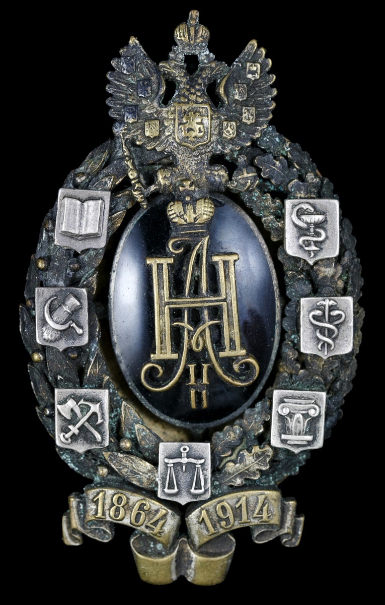 Russia. Imperial. Badge in Honor of the 50th Anniversary of Zemstvo. Silver, light gilt, black enamel. By Kortmann. Screwback, multipiece construction. Ciphers of Alexander II and Nicholas II at center on black, seven shields around emblematic of the activities of the Zemstvo establishments, dates "1864" and "1914" on ribbon below. Maker's name on large brass screwplate. P/B 4.22. Extremely Fine.