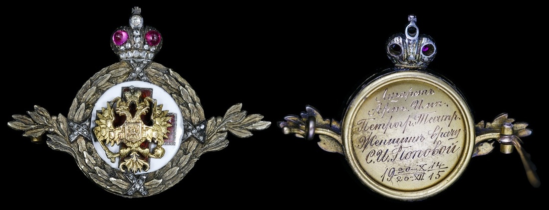 Russia. Imperial. Red Cross Badge. Red and white enamel. Set in a decorative brooch. Silver gilt, glass, and faceted stones. Multipiece construction, horizontal pinback. A small gilt Imperial eagle added to the central medallion, now separated. Wreath around red cross, leaves at side, crown above. Five-line Cyrillic legend engraved on back with dates Oct 20, 1914-December 26, 1915. Very Fine.