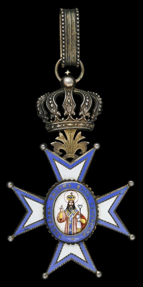 Serbia. Order of St. Sava. Badge. 50 x 79mm (including crown suspender). Silver gilt and enamels. The double-headed eagle Arms deliberately removed from the angles. Small chip to enamel at one cross tip and a few minor scuffs.