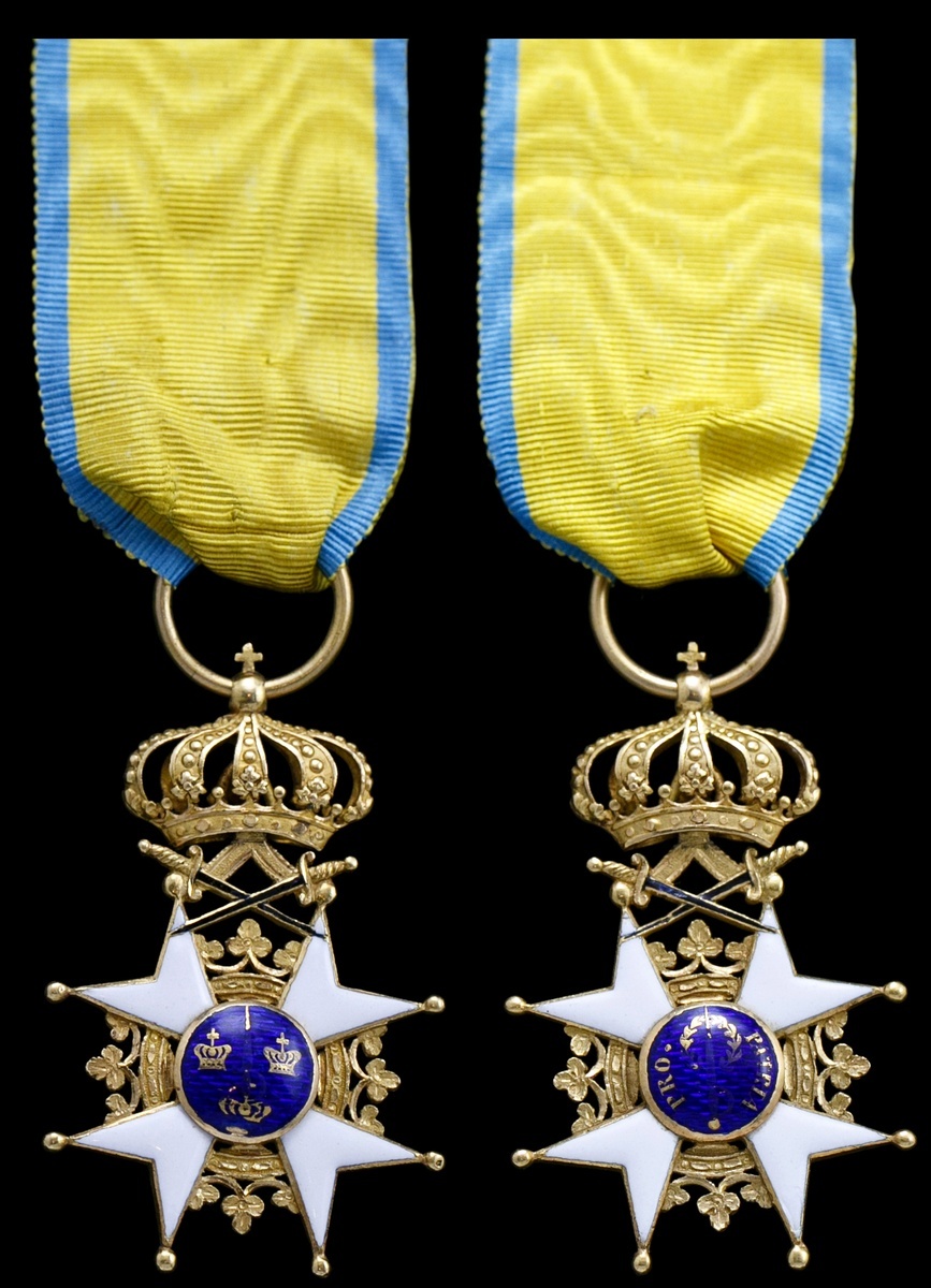 Sweden. Order of the Sword. Knight's Cross. Gold, white, blue, and black enamels, 33.2mm. On ribbon. Extremely Fine.