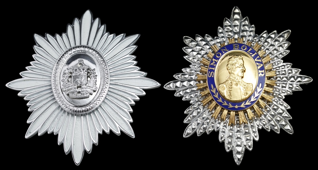 Venezuela. Order of the Liberator. Pair of modern Breast Stars by N.S Meyer, New York. Grand Star. 72 x 82mm. Gilt and enamels. Bolivar bust right. Vertical pinback (missing pin) and sidehooks. Star, 3rd Class. 75 x 81mm. White plaque. Vertical pinback with sidehooks. AU. (2)