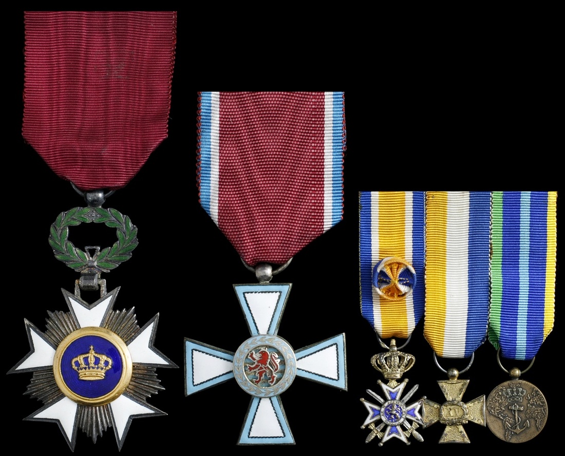 Benelux Orders Lot: Belgium. Order of the Crown. 4th Class Badge. Silver gilt and enamels. 44mm. EF; Luxembourg. Order of Merit. Knight's Badge. Silver and enamels. EF; and Netherlands. Miniature Group: Order of Orange-Nassau with swords, 15 Years Service Cross and Marine Medal.