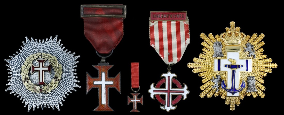 Group of Iberian Orders & Decorations. Portugal: Military Order of Christ. Breast Badge and miniature. Silver and enamels; and Breast Star. Gilt and enamels; Instituto Nun'Alvres Cross. Bronze and enamels; Spain: Air Force Order of Merit. Grand Cross Set. Sash Badge and Breast Star. Gilt and enamels; and Order of Naval Merit. Breast Star. Gilt and enamels. VF-Uncirculated.