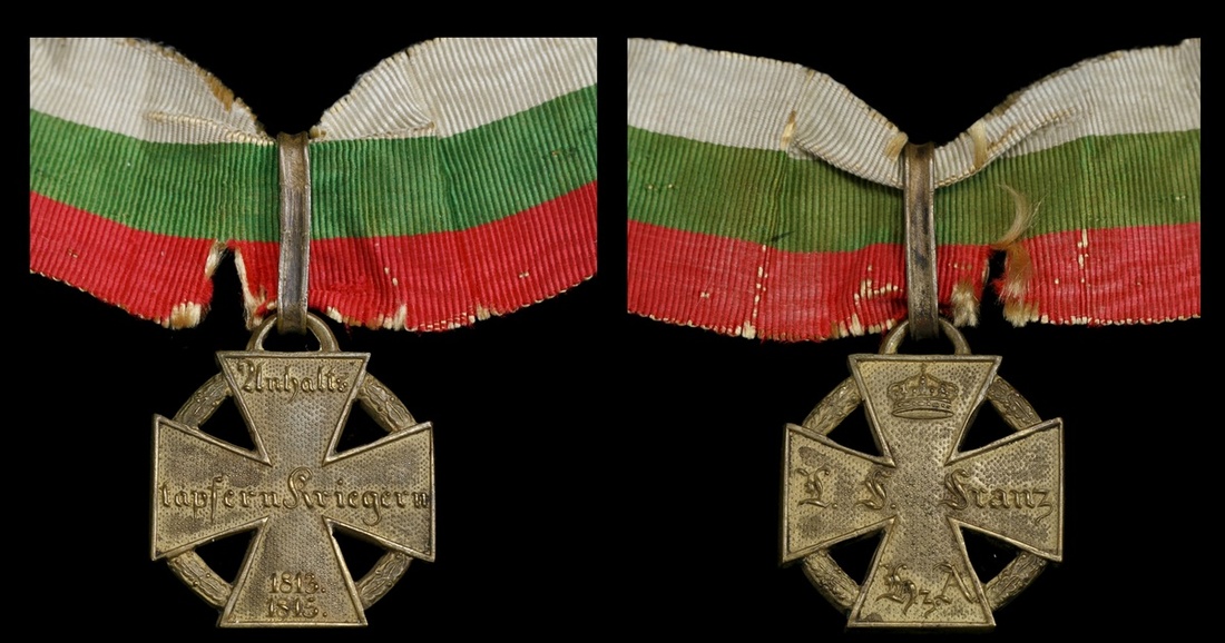 German States. Anhalt-Dessau. 1813-1815 Campaign Cross. Bronze, 28mm. Cross pattée, obverse: L.F. FRANZ, crown above, HzA below; German legend reverse: "To Anhalt's brave warriors 1813/1815". Pelleted fields. On old ribbon. Good Very Fine.