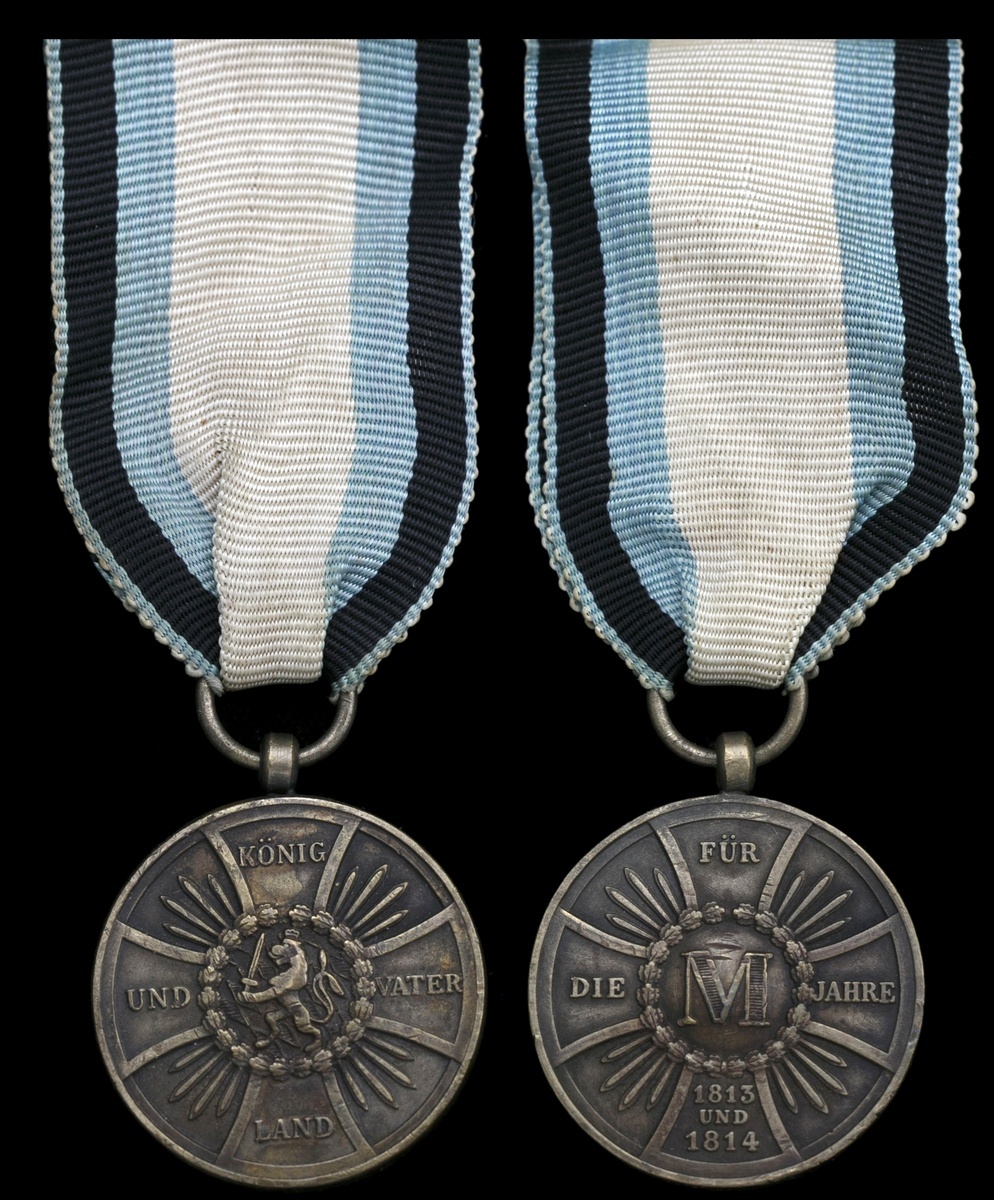 German States. Bavaria. 1813-1814 Military Merit Medal. Bronze, 30mm. Rampant lion left within wreath at center of cross. Very scarce. On ribbon. A few nicks. Very Fine.