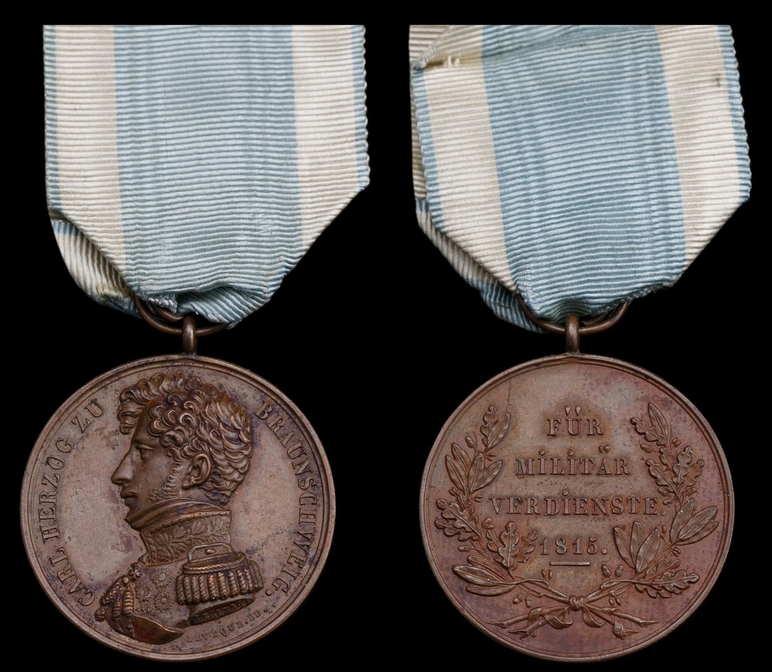 German States. Brunswick. Military Merit Medal 1815. Bronze, 33.6mm. Uniformed bust of Duke Carl II left. Rare. On period ribbon. Extremely Fine.