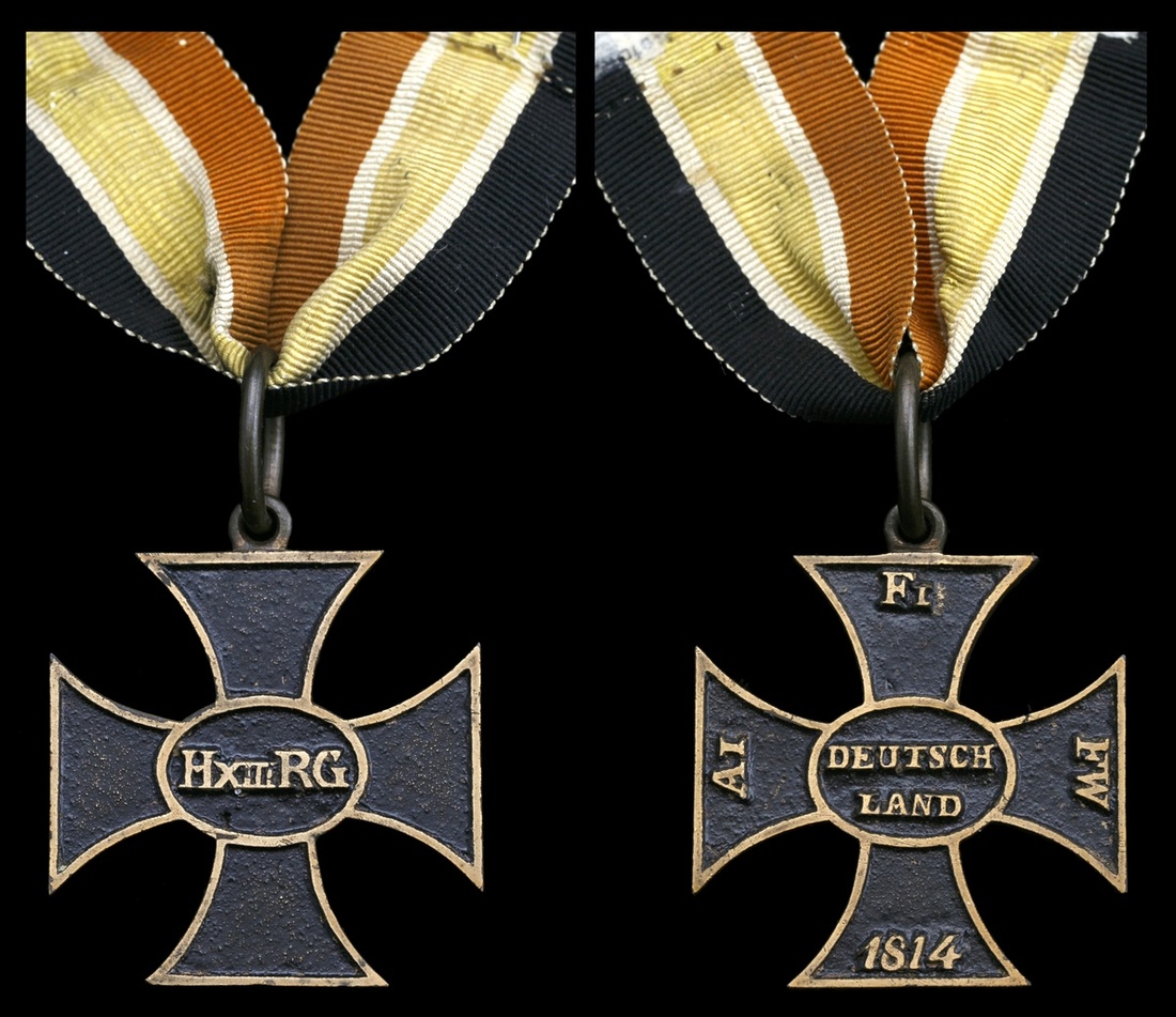 German States. Frankfurt. Cross of Honor for Officers of the rank and file, 1814. Blackened Bronze, 38mm. DEUTSCHLAND at center, FI (Franz I of Austria), FW (Friedrich Wilhelm of Prussia), AI (Tsar Alexander I of Russia) around, date below; HxiiiRG (Heinrich XIII of Reuss-Greiz) at back center. Instituted by Prince Heinrich XIII of Reuss-Greiz on the 22nd of October 1814 when he was Governor General of Frankfurt. 143 medals awarded. On ribbon. About Extremely Fine.