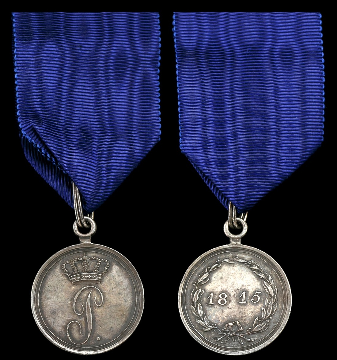 German States. Oldenburg. Waterloo Medal, 1815. Berlin mint. Silver, 28.3mm. Crowned cipher P; 1815 within wreath on reverse. Founded by Duke Peter Friedrich Ludwig and conferred on all officers and soldiers who fought under Feldmarschall Blücher during the Waterloo campaign of 1815. On replacement ribbon. Toned. Good Very Fine.