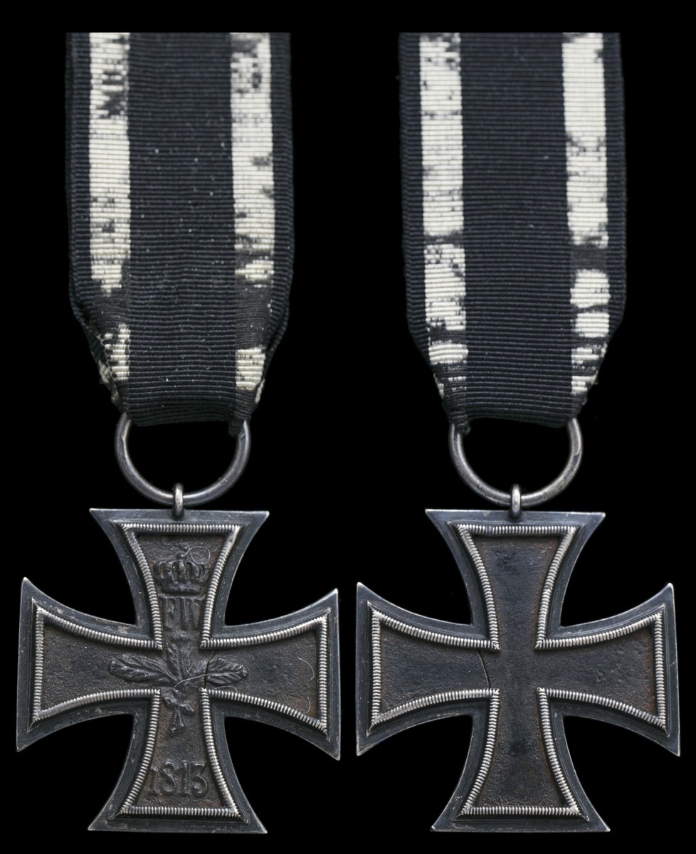 German States. Prussia. Iron Cross, 1813. Second Class. Blackened iron, silver frame, 42mm. On period ribbon. Extremely Fine.