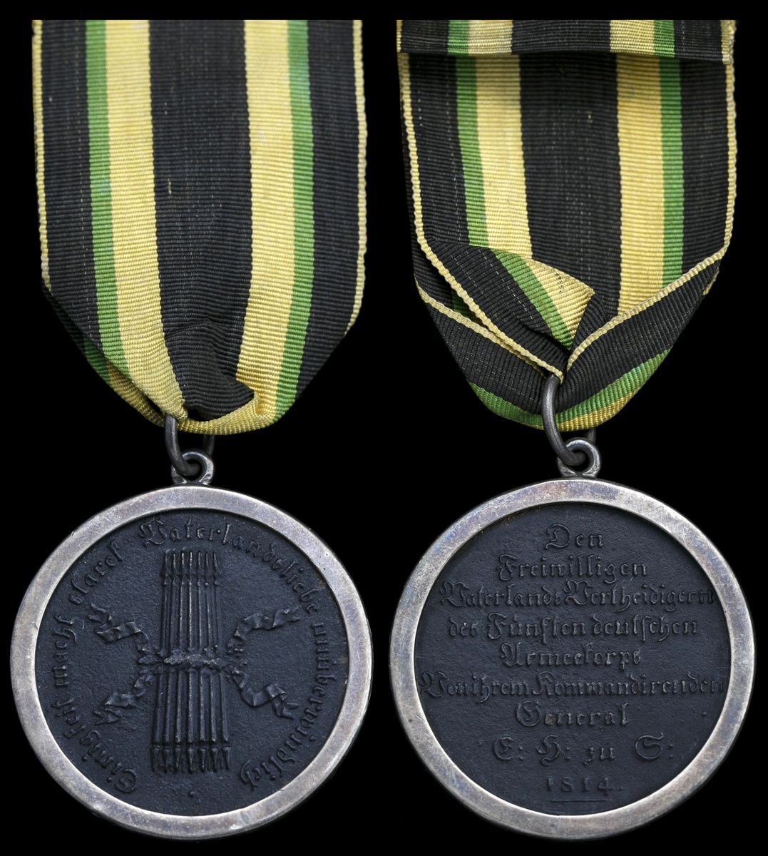 German States. Saxe-Coburg-Saalfeld. Medal for Volunteers of the Fifth German Army Corps, 1814. Blackened iron, silver edge. 1,575 medals awarded. On ribbon (light old adhesion). Extremely Fine.