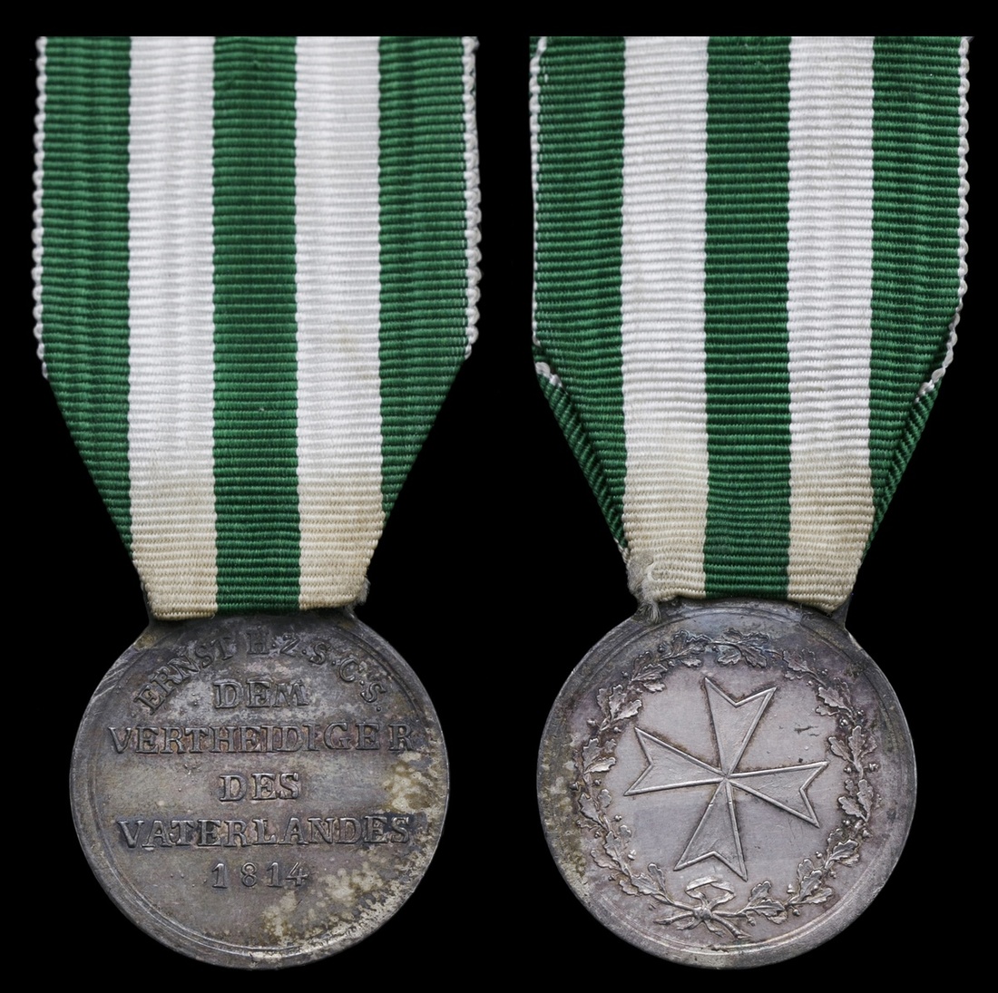 German States. Saxe-Coburg-Saalfeld. 1814-1815 Campaign Medal. Silver, 30.6mm. On ribbon. Toned over some minor contact marks. Extremely Fine and Rare.