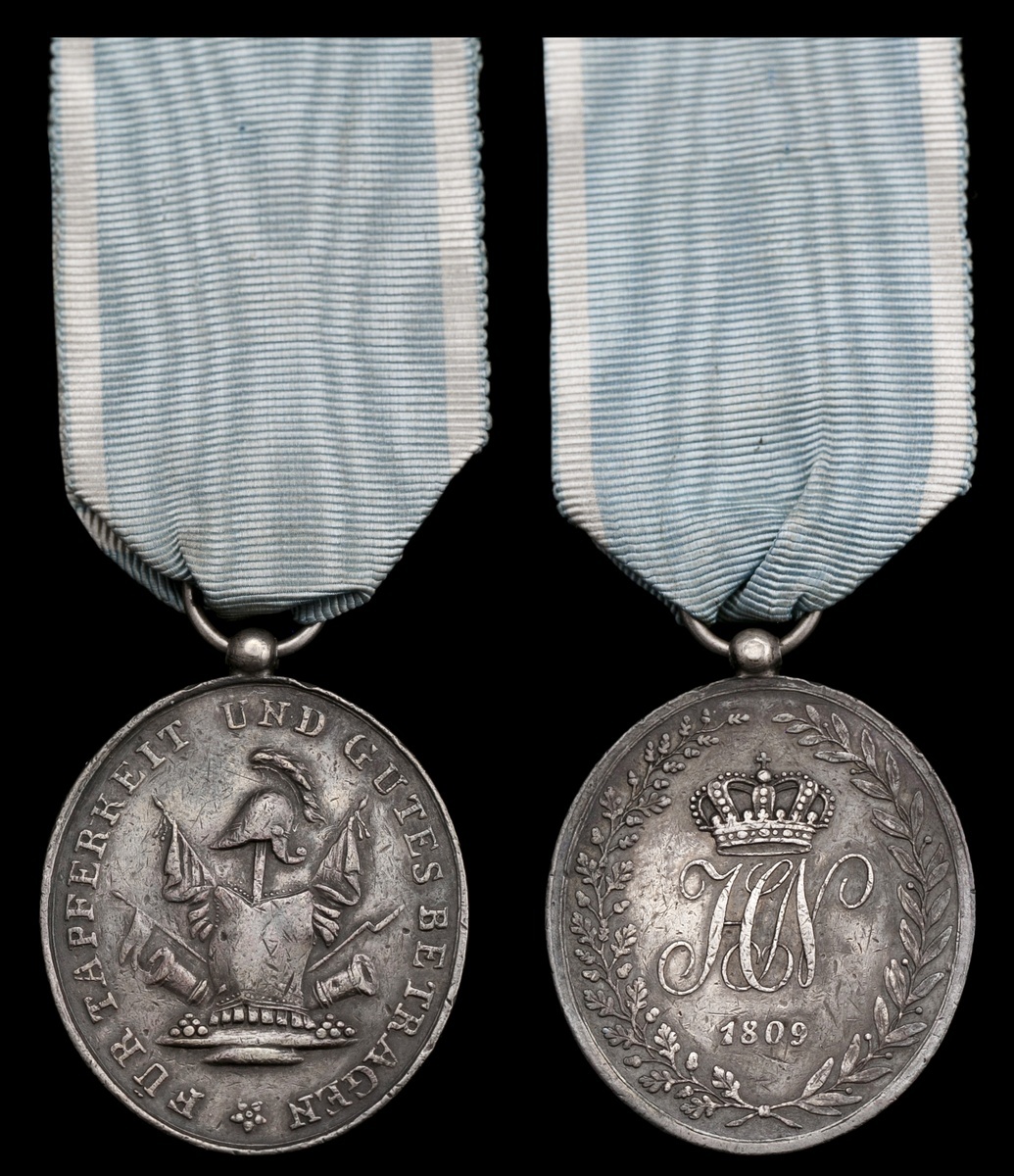 German States. Westphalia. Military Honor Medal 1809. Silver. Type II. Oval, 32.5 x 37mm. Trophy with banners and cannons, six cannonballs each side; crowned HW monogram above date within wreath on reverse. A Rare officially produced medal. On ribbon. Toned over contact marks. Very Fine.