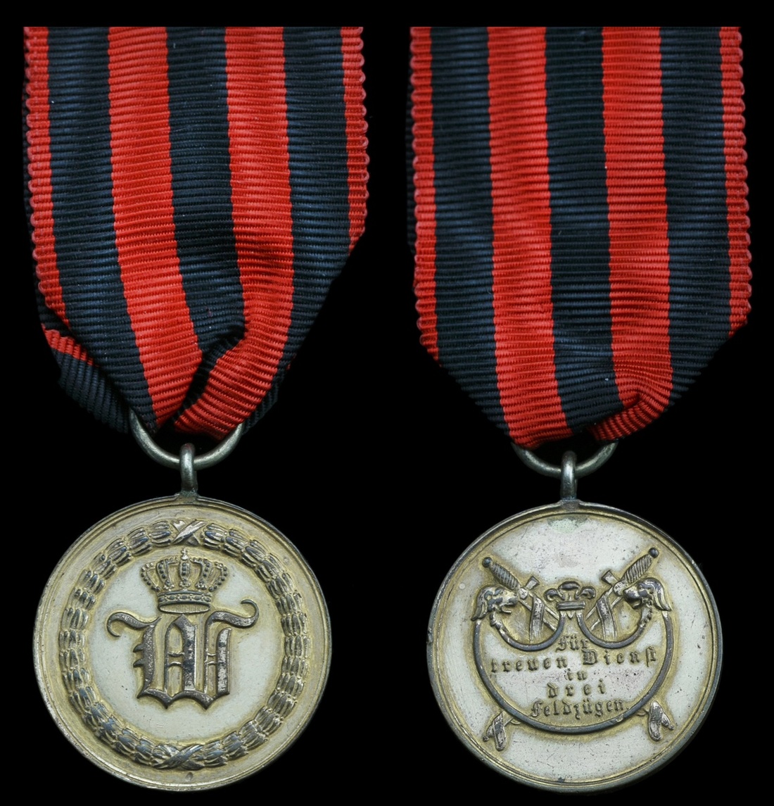 German States. Württemburg. Medal for Loyal Service in the Campaigns of 1793-1815. Three Campaigns. Gilt Bronze, 29.5mm. Crowned monogram within wreath, no initials; dog-headed, gorget-like shield inscribed in German "For faithful service in three campaigns", crossed swords behind. The bronze for the medal came from smelted cannons. On ribbon. Some tooling in monogram. Very Fine.
