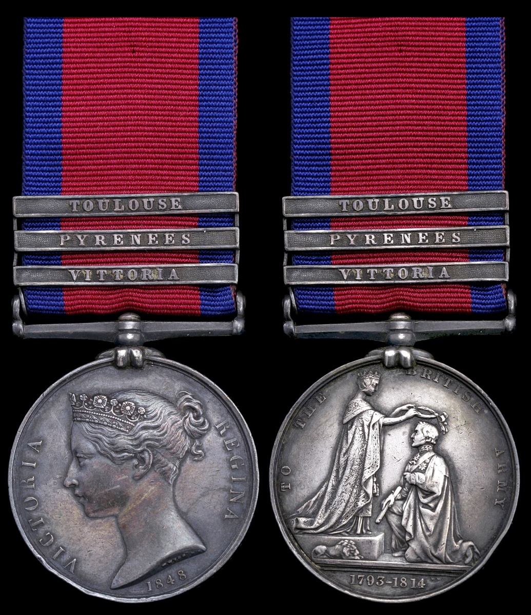 Great Britain. Military General Service Medal, 1793-1814. Three clasps: "Vittora", "Pyrenees", and "Toulouse" (CHAS BECKETT, ARTY DRIVERS). Charles Beckett enlisted in 1803 and was honorably discharged August 9, 1814, serving as a driver on L Troop. On ribbon. Tiny rim bruise. Toned. Very Fine. Comes with documentation.