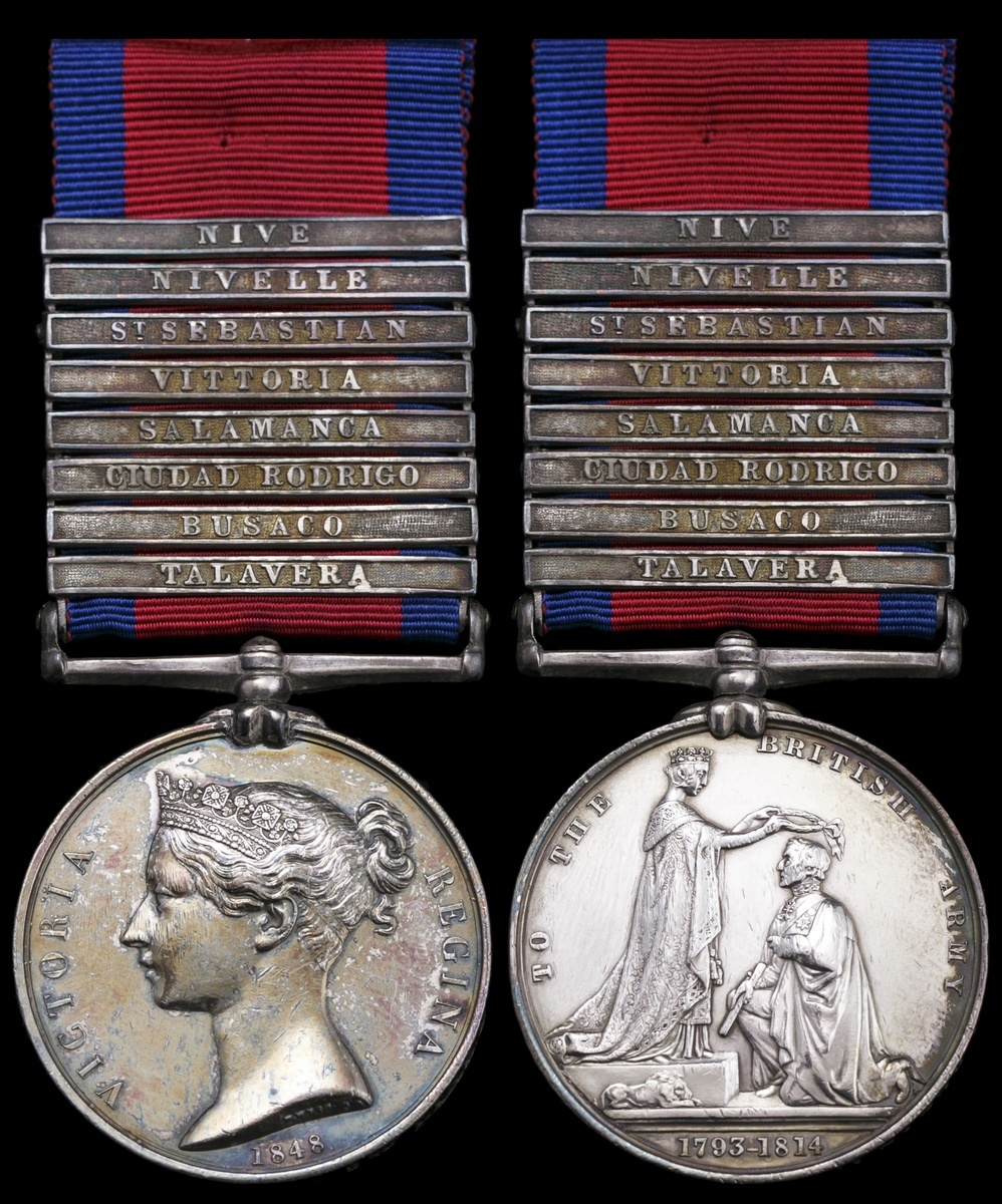 Great Britain. Military General Service Medal, 1793-1814. 8 clasps: "Talavera", "Busaco", "Ciudad Rodrigo", "Salamanca", "Vittora", "St. Sebastian", "Nivelle" and "Nive" (LUDOLPH BENING, CORPL 2ND LINE BN R.G.L.). Born in Hildesheim, Hannover, Corporal Ludolph Bening, served in the 2nd Battalion of the Line, King's German Legion for 14 years and 72 days. He received a severe wound with a musket ball in the right foot in the battle of Waterloo and was honorably discharged February 1, 1816. On ribbon. Once polished. Toned over some old contact marks. Extremely Fine. Comes with documentation.