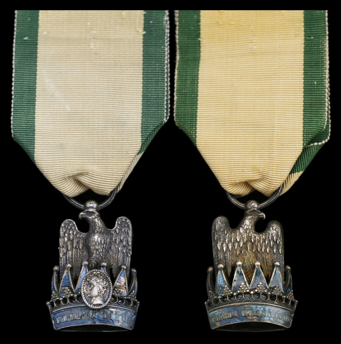 Italian States. Napoleonic Kingdom of Italy. Corona de Fer. Knight's breast badge. Gold, silver and dark blue enamel with light gilt medallion of Napoleon facing left, 34 x 23mm. 500 awarded. Most of the Italian insignia were destroyed in exchange for the Austrian Iron Crown after 1816. Very rare. On ribbon. Enamel loss at two crown tips. Very Fine.