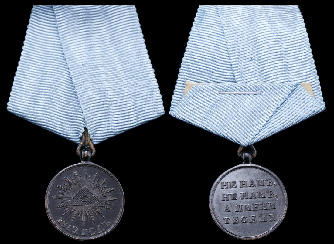 Russia. Award Medal for the Patriotic War, 1812. Bronze, 24mm. Blackened. Chep 1548. On sky-blue moiré ribbon. Extremely Fine.