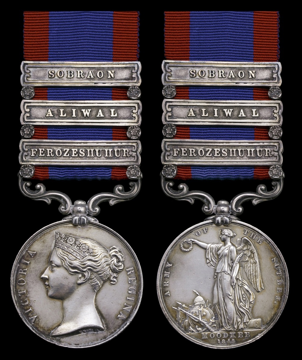 Great Britain. Sutlej Medal, 1845-1846. Three clasps: "Ferozeshuhur", "Aliwal" and "Sobraon" (50th REGT). Impressed. On ribbon. Toned over hairlines. Extremely Fine.