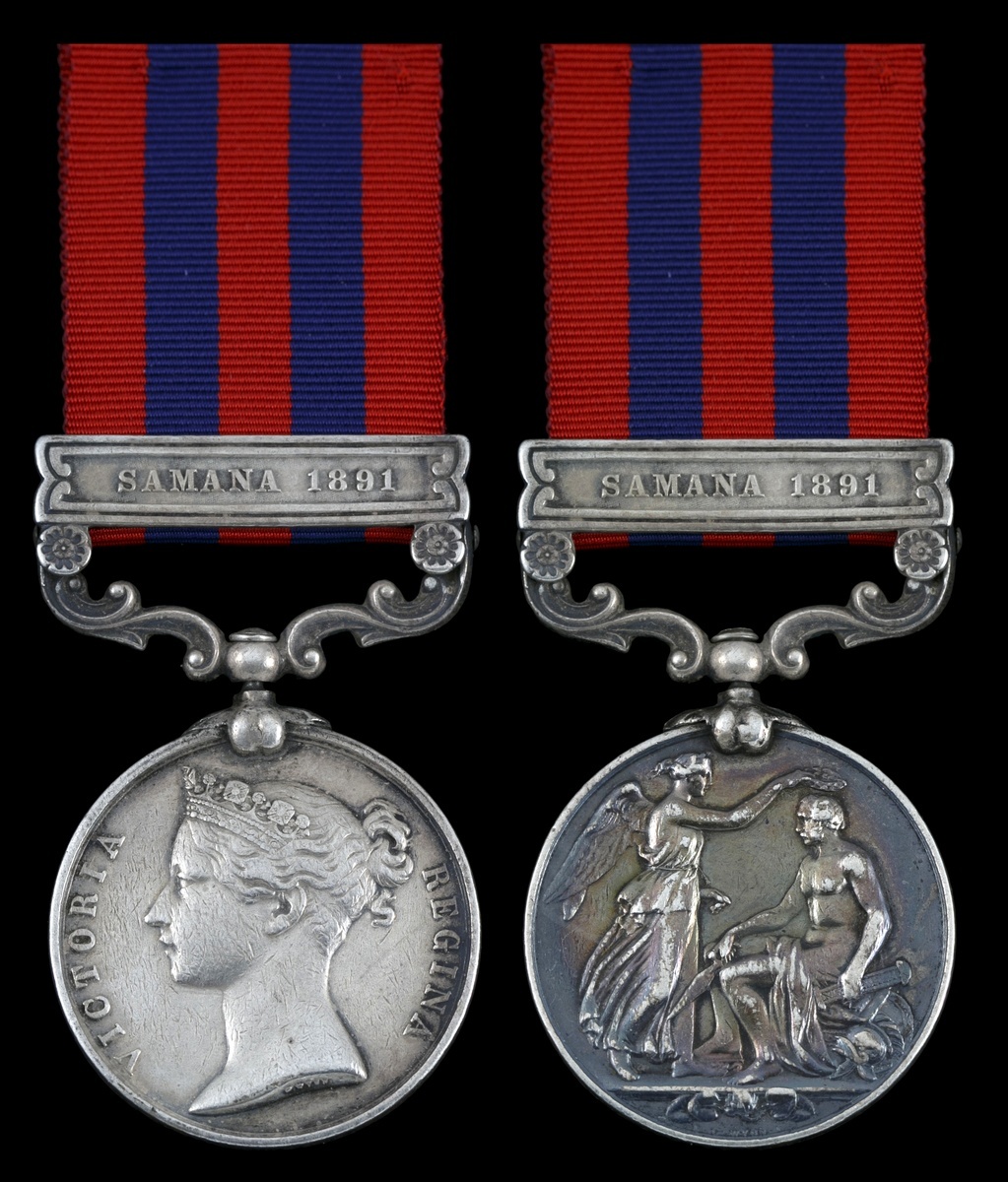 Great Britain. India General Service Medal, 1854-1895. One clasp: "Samana 1891" (2715 Sepoy Kunda Singh 15th Bl Infy). Engraved. On ribbon. A number of contact marks. About VF.