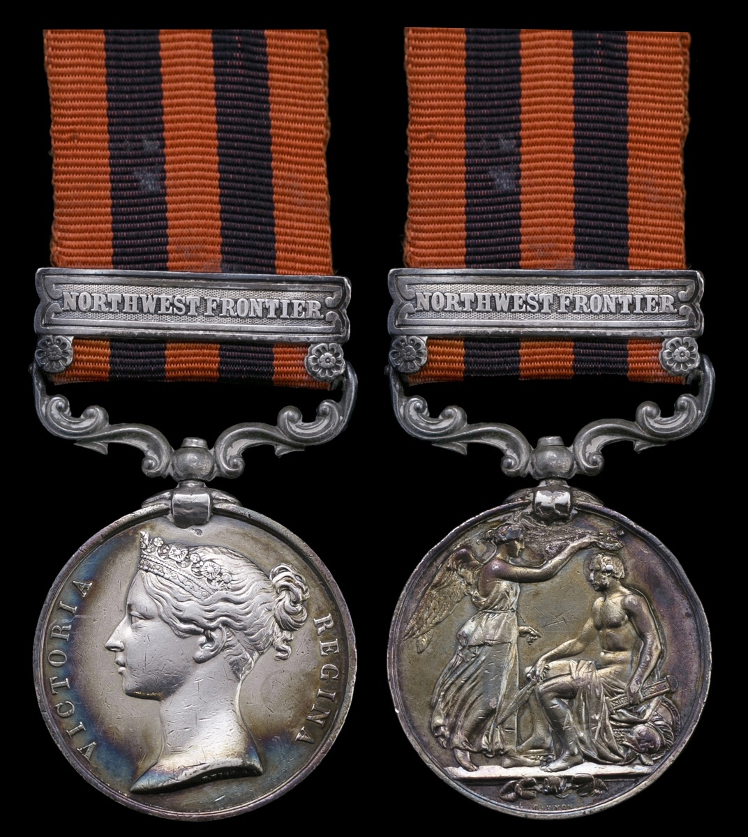 Great Britain. India General Service Medal, 1854-1895. One clasp: "Northwest Frontier". Naming worn and only partially legible. Engraved. On ribbon. Toned over some contact marks. Very Fine.