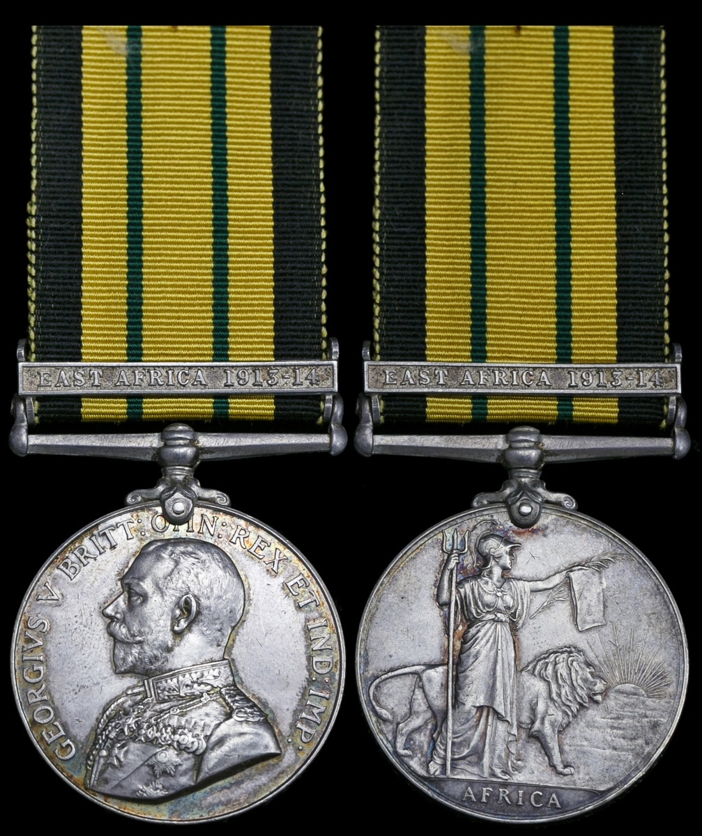 Great Britain. Africa General Service Medal, 1902-1956. George V. One clasp: "East Africa 1913-14" (19 NAIK DIN MOHAMED. S.&.T.C. I.A). Confirmed on roll (copy of which included). Impressed. On ribbon. Toned over some light old friction hairlines. Extremely Fine.