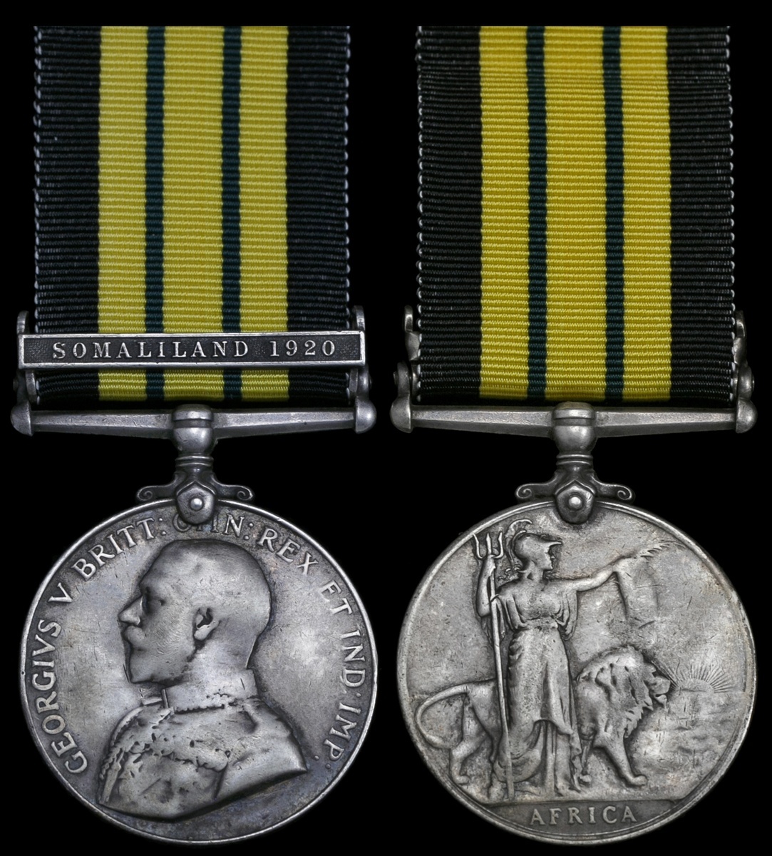 Great Britain. Africa General Service Medal, 1902-1956. George V. One clasp: "Somaliland 1920" (2 700 PTE. JANUARY 2 - K.A.RIF.). Confirmed on roll (copy of which included). Impressed. On ribbon. Well worn, Very Good.