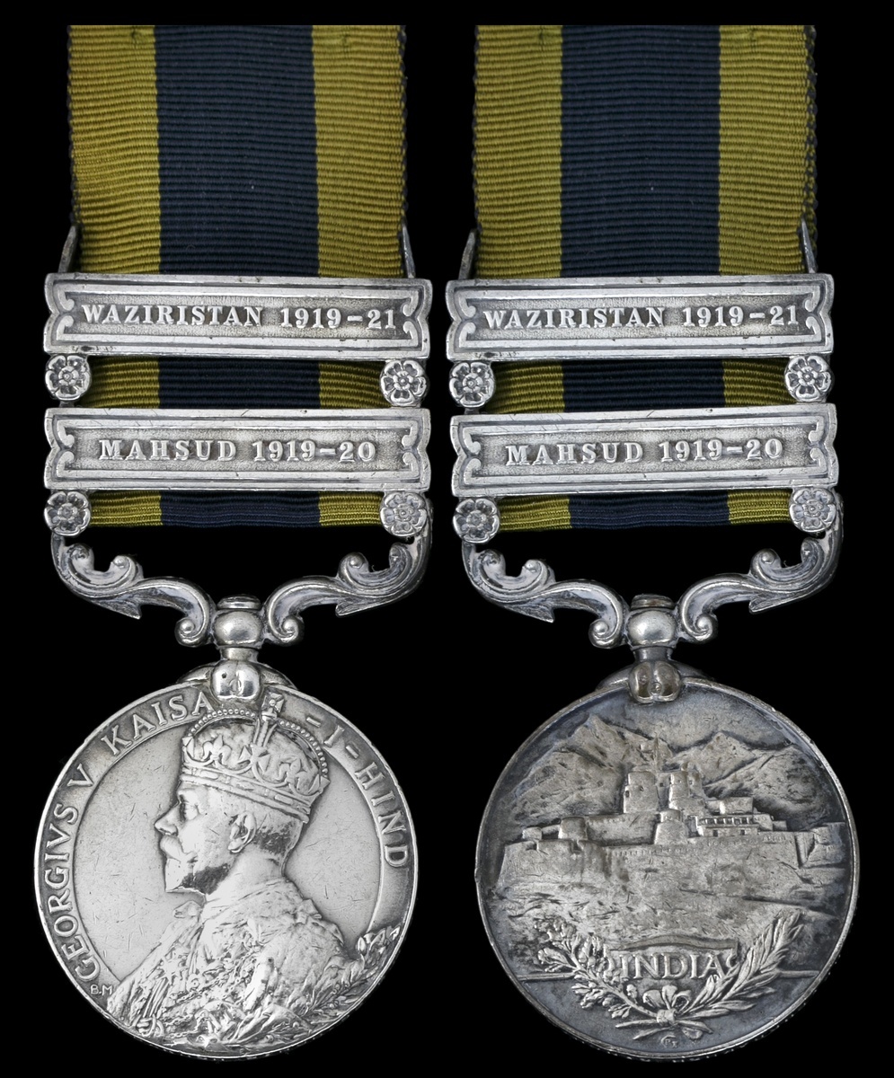 Great Britain. India General Service Medal, 1908-1935. George V. Kaisar-i-Hind. Two clasps: "Mahsud 1919-20" and "Waziristan 1919-21" (2180 NK, GURBAKSH SINGH, 82 PJBIS,). Impressed. On ribbon. Lightly toned. EF.