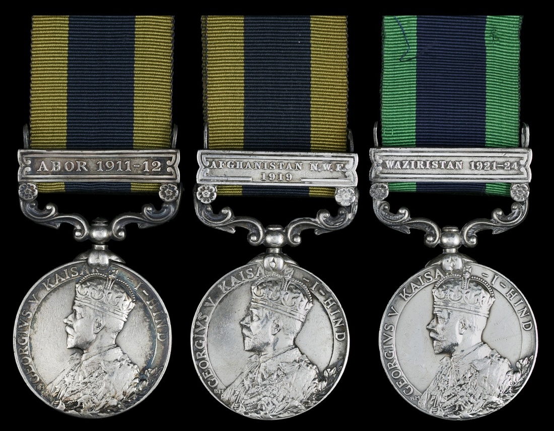 Great Britain. Trio of India General Service Medals, 1908-1935. George V. Kaisar-i-Hind. Each with one clasp: "Abor 1911-12", "Afghanistan N.W. 1919" and "Waziristan 1921-24". All named to Indian Army soldiers, one engraved, two impressed. On ribbons. Latter with scratches and reed marks. VF-EF. (3)