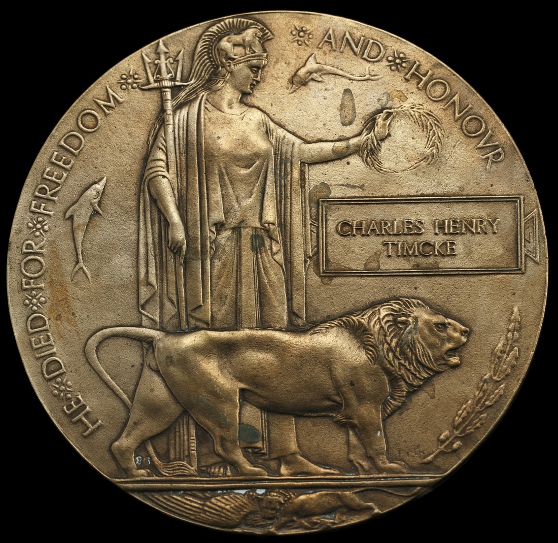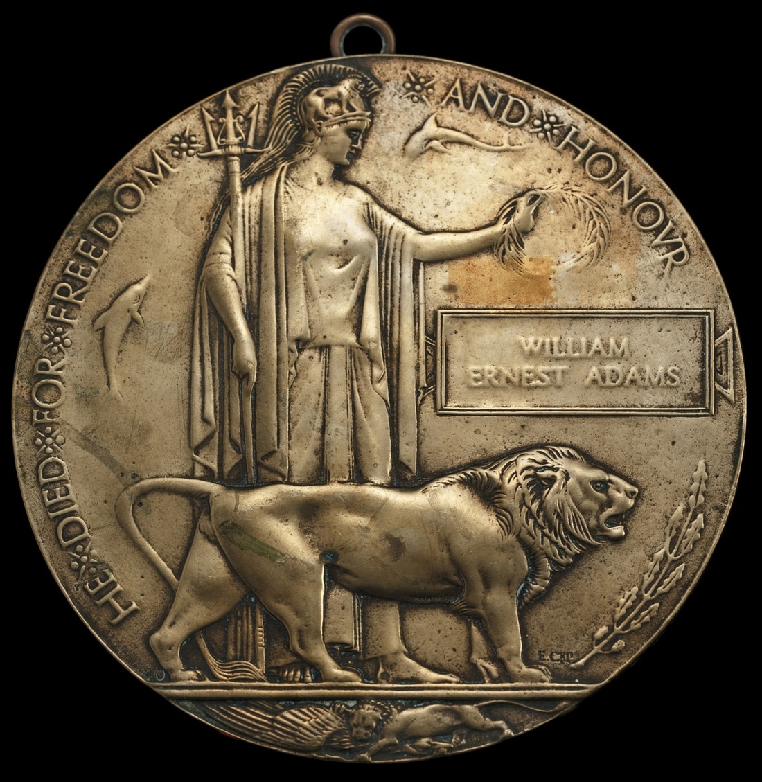 Great Britain. Pair of WWI Memorial Plaques. Named: "Charles Henry Timcke" and "William Ernest Adams". The latter with added suspension loop. Both cleaned. Extremely Fine. (2)
