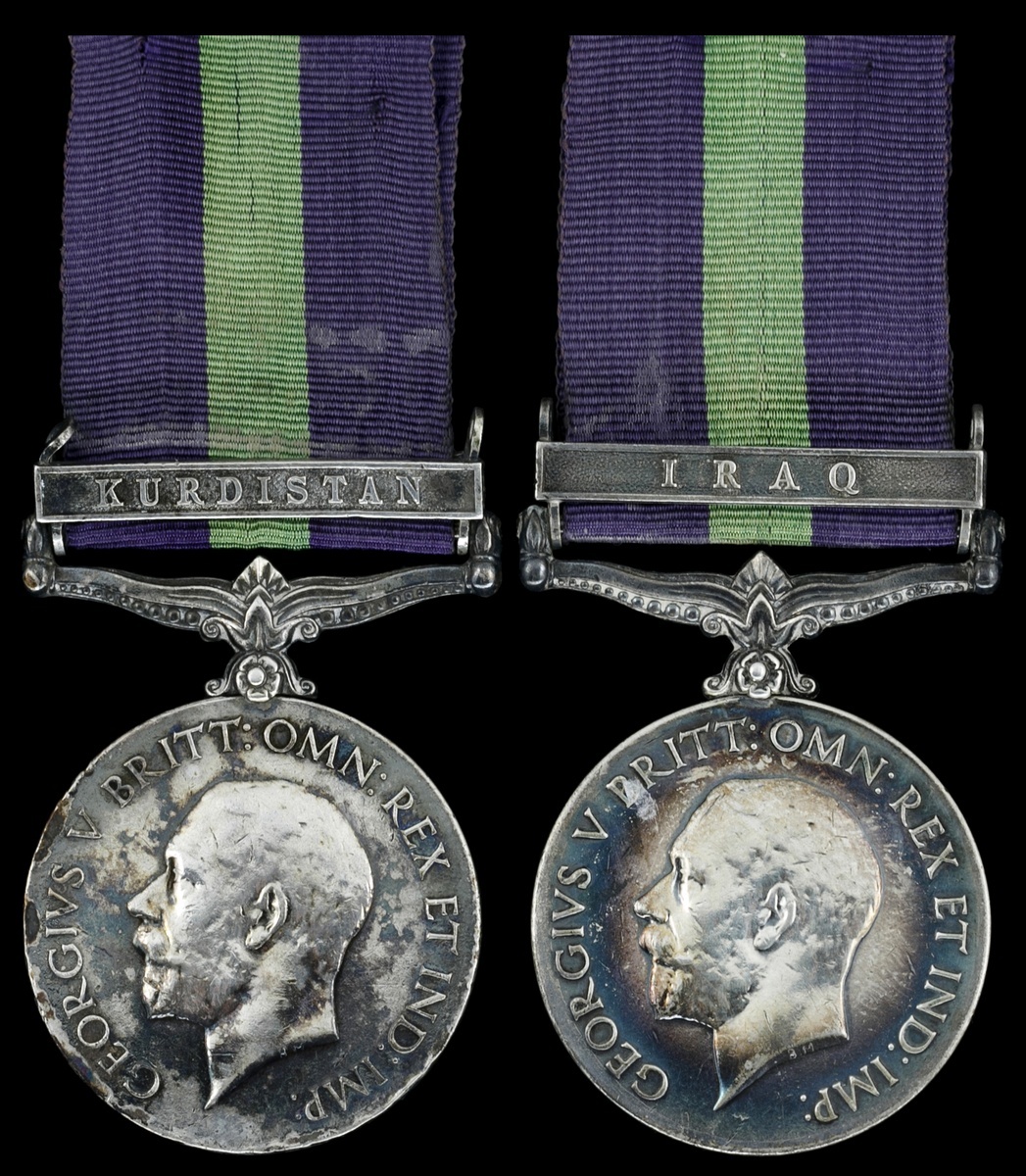 Great Britain. Pair of General Service Medals, 1918-1962. George V. Each with one clasp: "Kurdistan" (3000 SEPOY KIRTA. 48-PIONEERS) and "Iraq" (6307 SPR. MOHD AFSAR. BENGAL S. 7 M.). On ribbons. First toned over light corrosion at edge. Very Fine. (2)