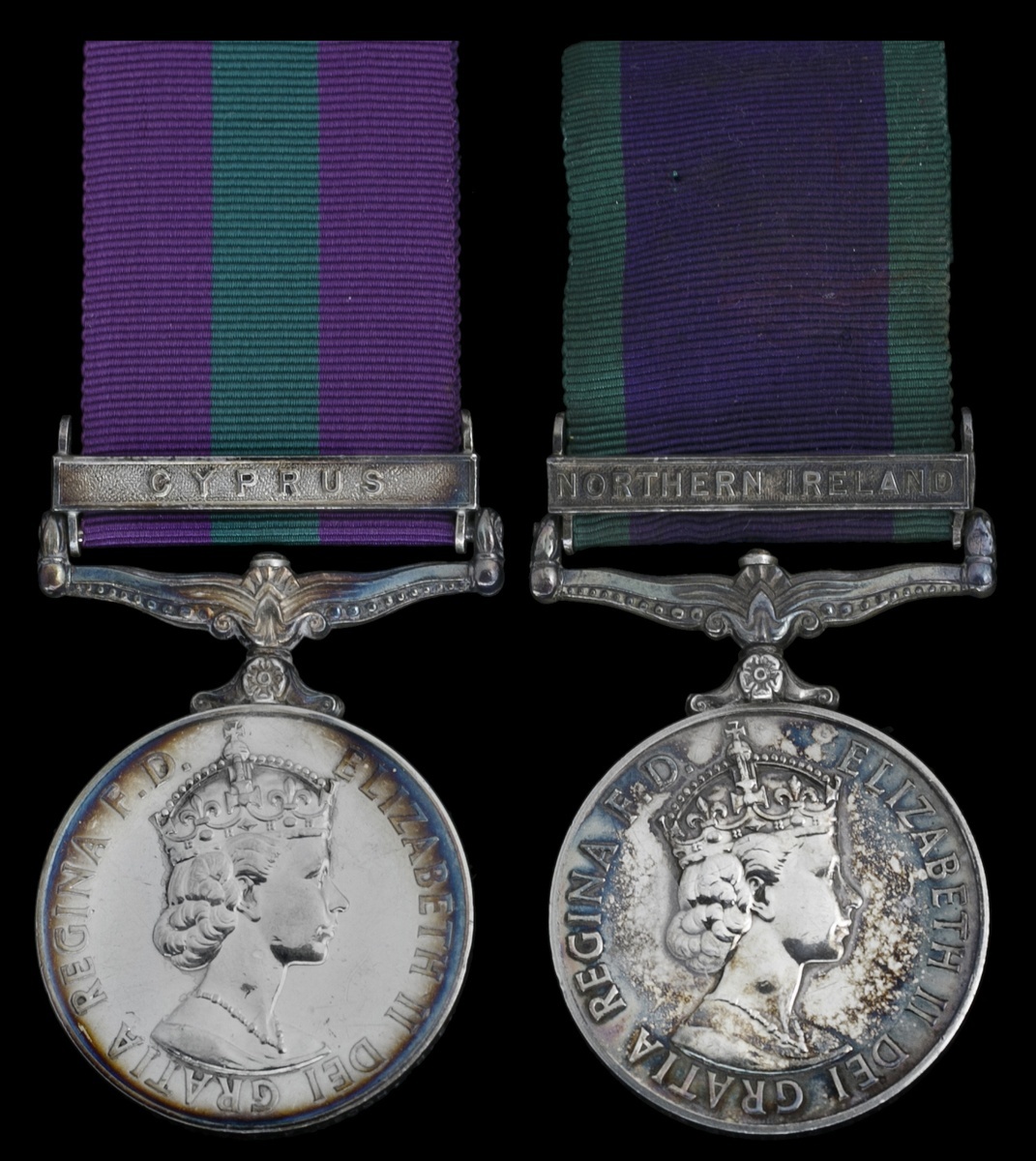 Great Britain. Pair of Elizabeth II-era medals: General Service Medal, 1918-1962. One clasp: "Cyprus" (23544609 SPR.W.T.F.KEOGH.R.E.); and General Service Medal, 1962-2007. One clasp: "Northern Ireland" (24364646 GNR.P.C.GATER RA.). Both on ribbons. Toned, the first over a few obv. scratches. AU-Uncirculated. (2)