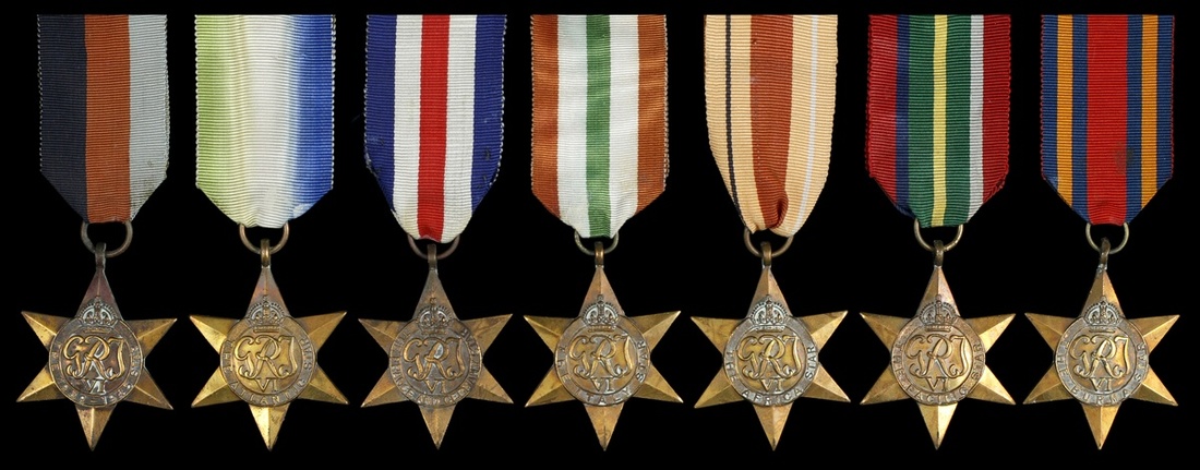 Great Britain. Lot of WWII Medals. Includes: 1939-45, Atlantic, Africa, Italy, France and Germany, Burma, and Pacific Stars; Defense and War Medals, and India Service Medal; also 1947 Indian Independence Medal, and WWI Mercantile Marine War Medal. All on ribbons. VF-EF. (12)