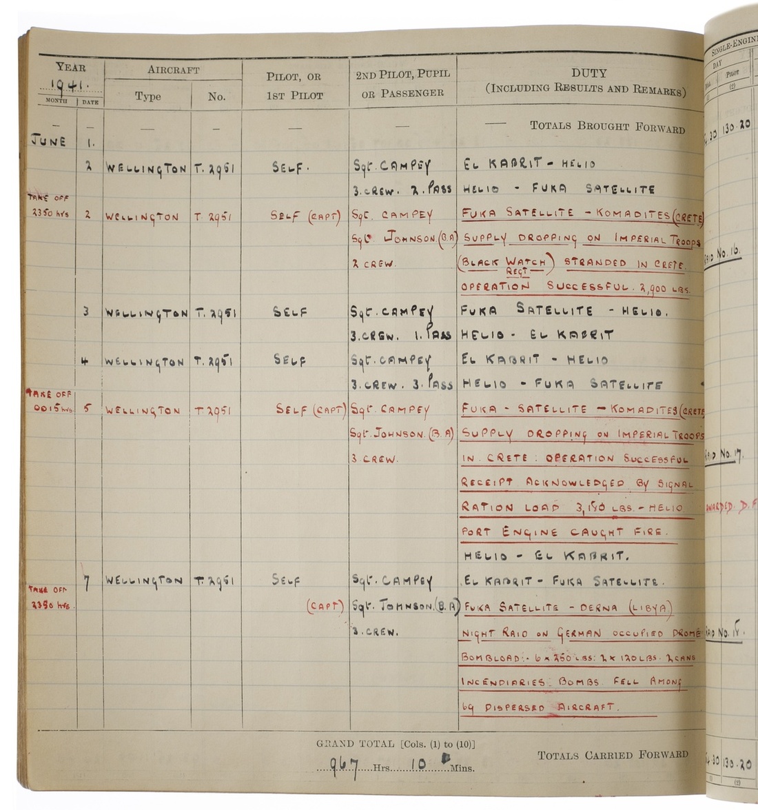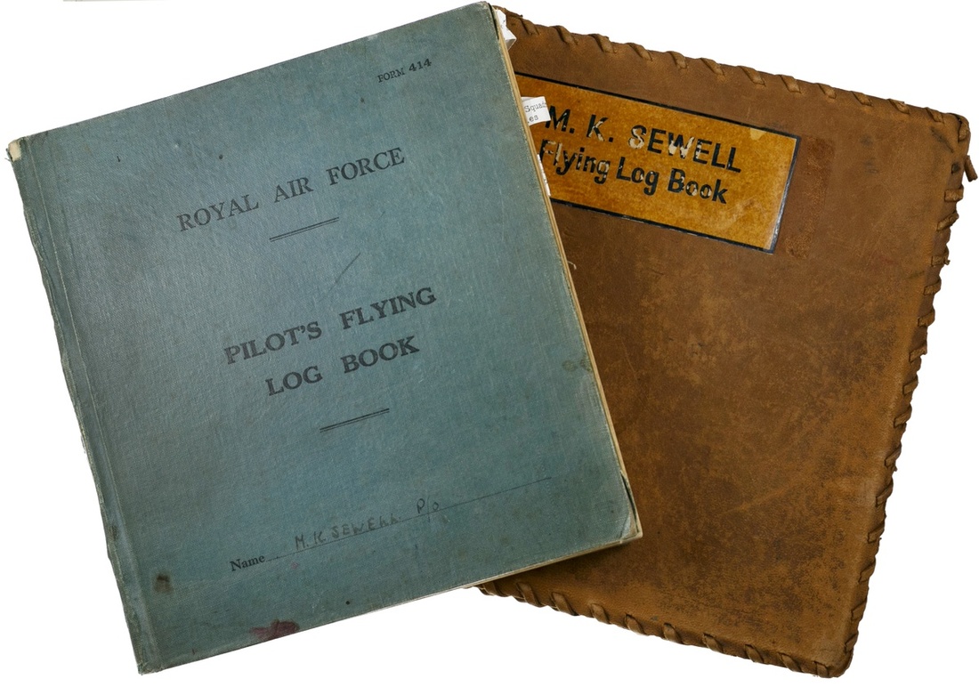 Distinguished Flying Cross - George VI; Air Force Cross - George VI; General Service Medal-George VI with "Palestine" clasp; 1939-1945 Star; Air Crew Europe Star with "France and Germany" clasp; Defense Medal; and WWII Medal with oak leaf; rose and oak leaf on bar. Also included: two ribbon bars, two of Sewell's RAF embroidered insignia; and Sewell's two RAF Pilot Flying Log Books, 1939-1957; two Buckingham Palace admission passes for the June 30 1942 investiture; notice of and congratulations on Sewell's D.F.C. and A.F.C. and newpaper clips regarding his D.F.C.
