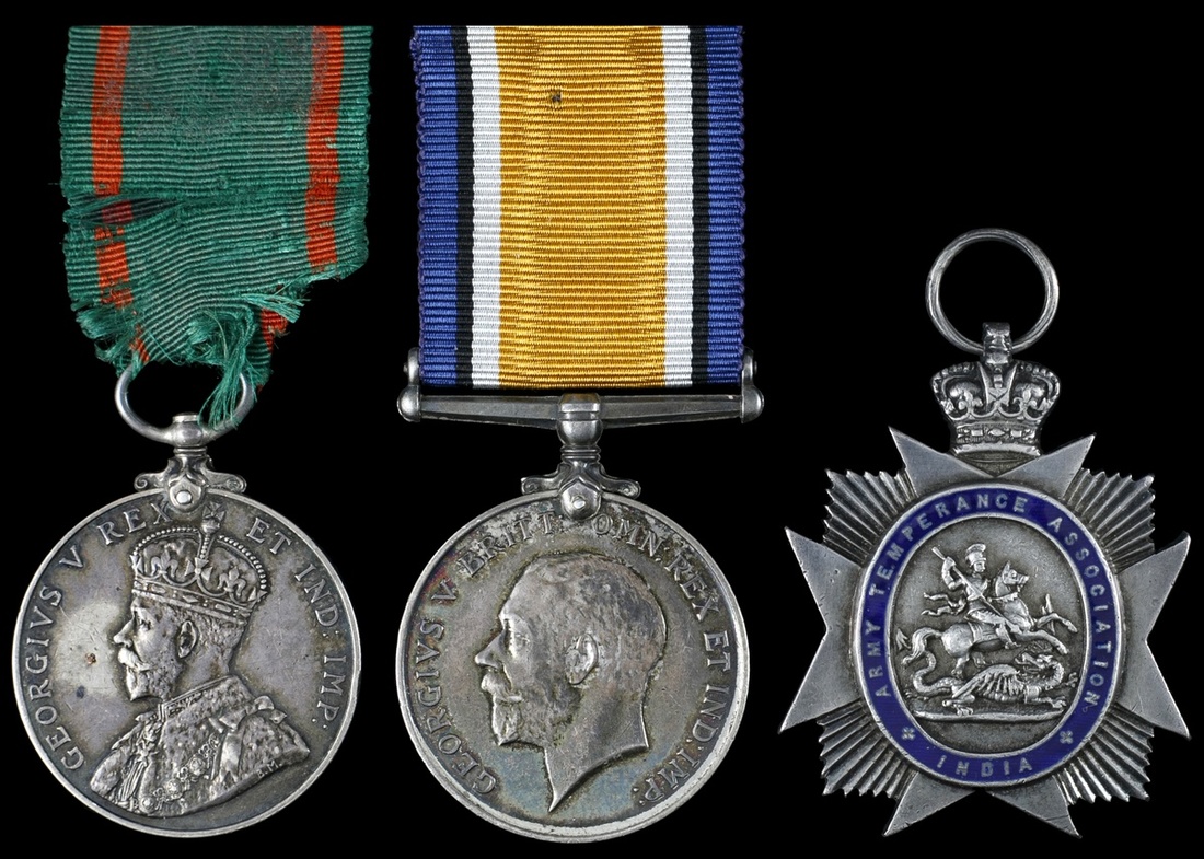 Great Britain. Trio of Medals: George V Visit to Ireland 1911; War Medal 1914-1918 (9078 PTE. E. BASSHAM.K.R.RIF.C.). Both on ribbons; and Army Temperance Association - India. 5 Years Fidelity Badge. Silver and blue enamel. VF-EF. (3)