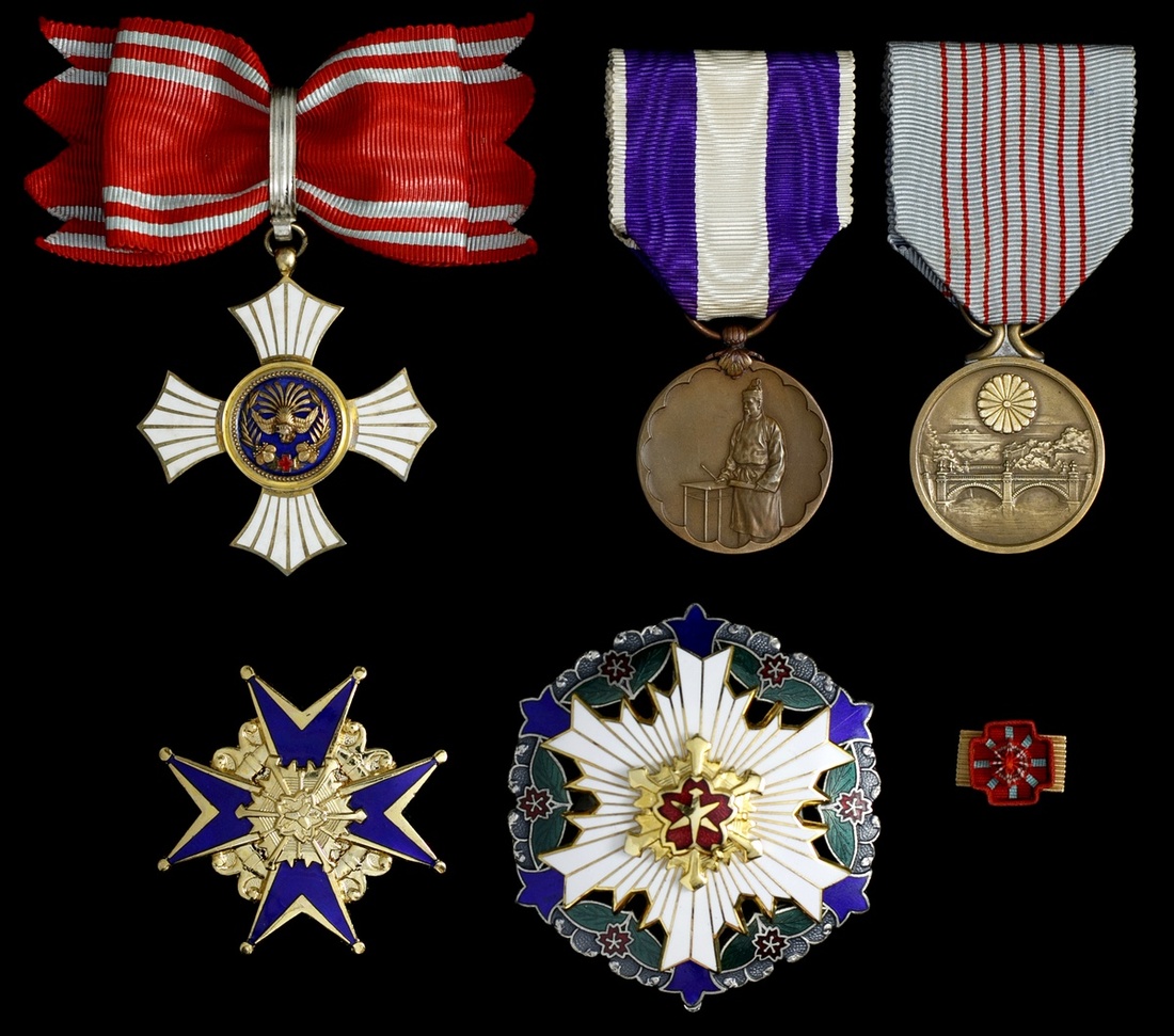 Japan. Group of Medals and Badges. Includes: Red Cross Order of Merit for Women. Silver gilt and enamels, 1920 Census Medal, 2600th Anniversary Medal, uncertain cruciform badge (possibly a fire brigade badge) and a large enameled badge. All in cases of issue. Extremely Fine. (5)